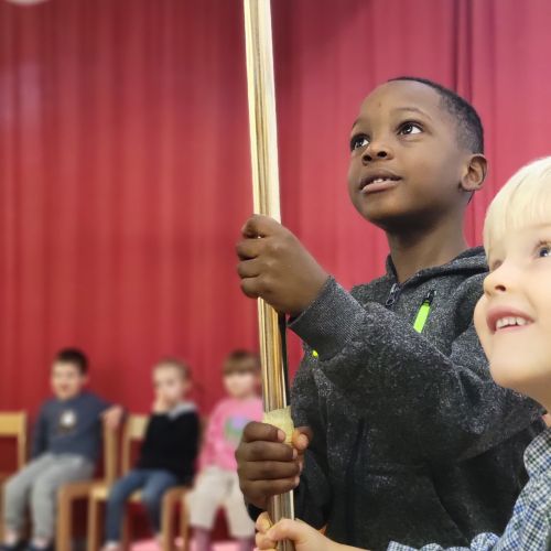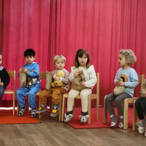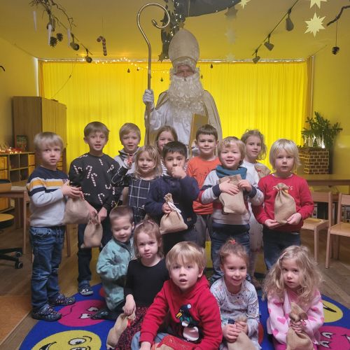 Dann stimmen alle Kinder zusammen das Nikolaus-Lied „Lasst uns froh und munter sein“ an und der Heilige Nikolaus schreitet würdevoll aus dem Raum – zur nächsten Gruppe.