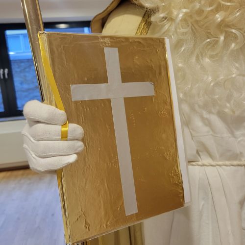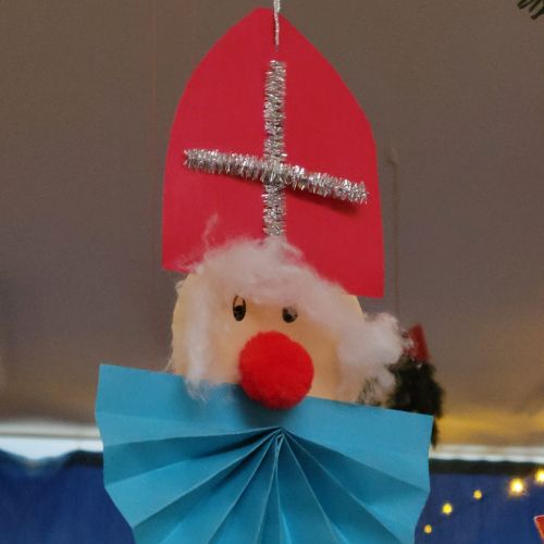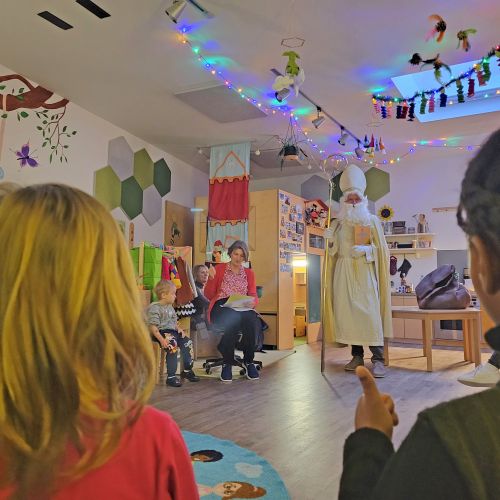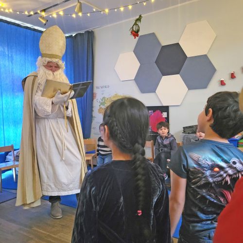 Bum, bum, bum. Drei Mal klopft es laut und eindringlich an der Tür. Abigail macht große Augen. Anton schlägt die Hände vor den Mund und versteckt sein Grinsen. Auch die anderen Kinder schauen zur Tür und scheinen fast den Atem anzuhalten. Dann bewegt sich die Klinke nach unten und im Türspalt erscheint eine große Gestalt mit weißem Vollbart, cremefarbenem Umhang und goldener Mitra.