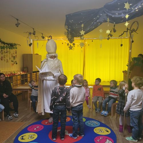 Leicht den Kopf geneigt, damit die Mitra nicht vom Kopf fällt, schreitet der Nikolaus milde lächelnd in den Raum der grünen Gruppe. 25 Augenpaare verfolgen gebannt jede seiner Bewegungen. Erzieherin Regina Weiß heißt den Heiligen willkommen. Die Kinder sitzen im Stuhlkreis und lauschen gespannt, als der Nikolaus sein Buch aufschlägt und vorzulesen beginnt.